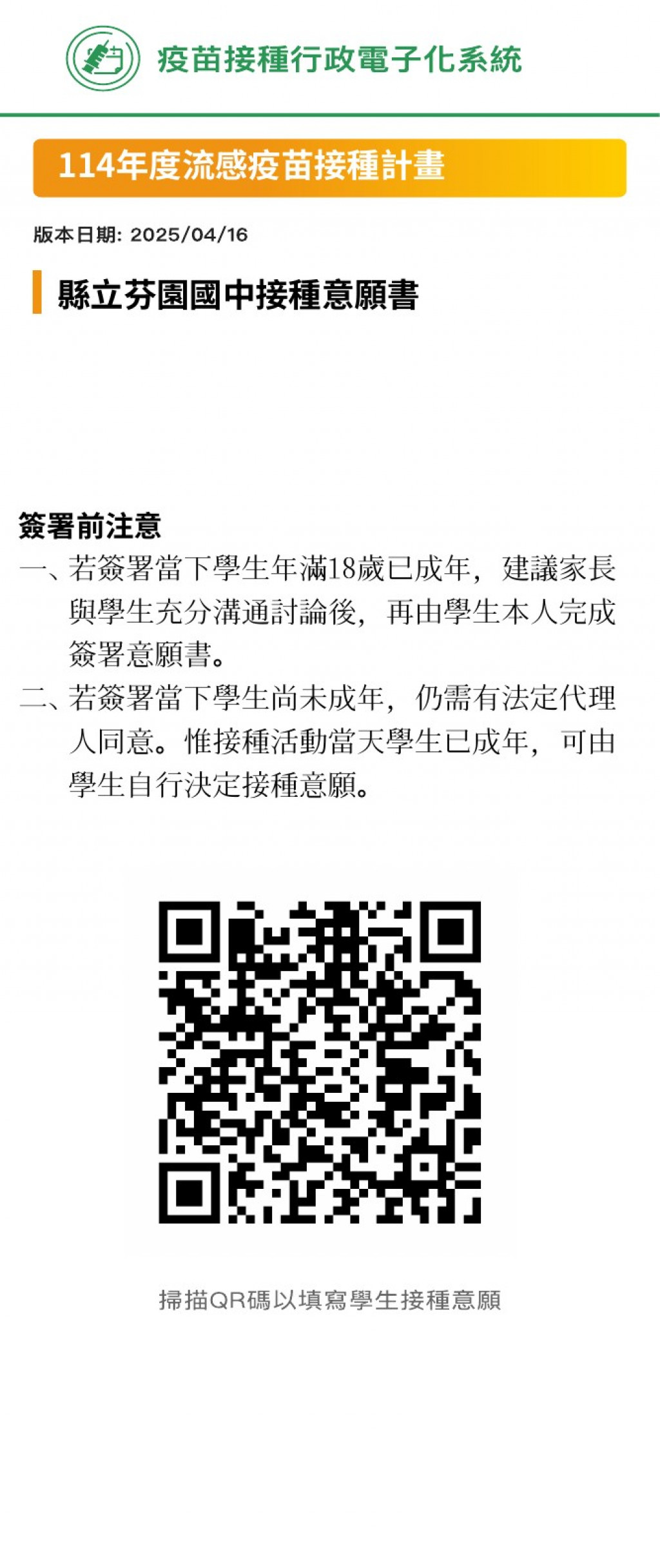 二、若簽署當下學生尚未成年,仍需有法定代理人同意。惟接種活動當天學生已成年,可由學生自行決定接種意願。