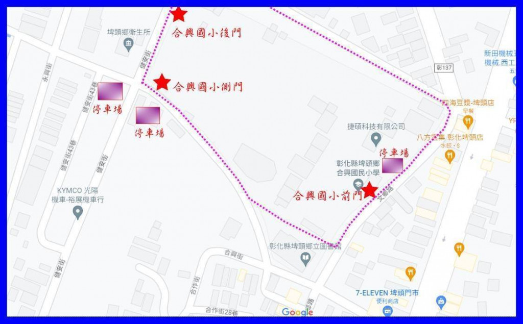 五、檢附生成網頁參考圖、合興國小及東興國小車輛行徑及停放示意圖各1份。