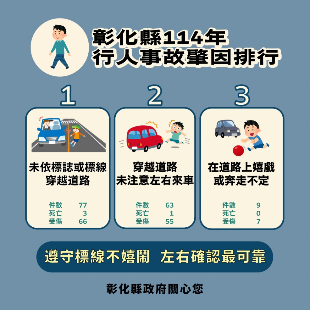附件為「114年1-12月彰化縣交通事故死傷人數增加排行、本縣各鄉鎮市30日死亡人數、各運具交通事故肇因及肇事熱點」共5份統計資料宣導圖,社群宣導內容可參閱或分享本處「花現彰化-彰化縣政府新聞處」(https://pse.is/8uqkdl)臉書粉絲專頁。 |