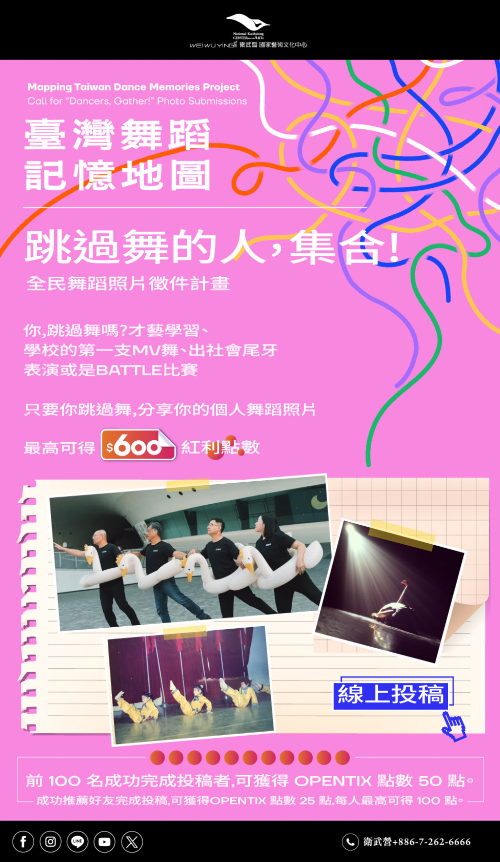| (二) | 「跳過舞的人,集合!」全民舞蹈照片徵件活動參考簡章(附件二)或衛武營官網網址:https://npacwwy.tw/en08gMrIj,邀請師生共同參與投稿,擴大舞蹈記憶之蒐集與交流。 |