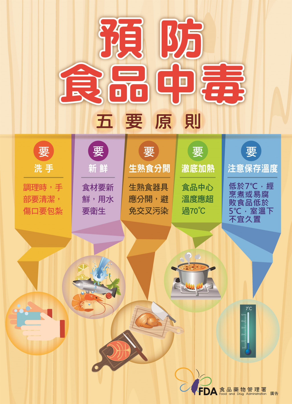 | (一) | 預防食品中毒之「5要2不」原則,包括:「要洗手」、「要新鮮」、「要生熟食分開」、「要澈底加熱」、「要注意保存溫度」、「不飲用山泉水」及「不採、不食、不贈予、不收受不明動植物」,以降低交叉污染及病原滋生風險。 |